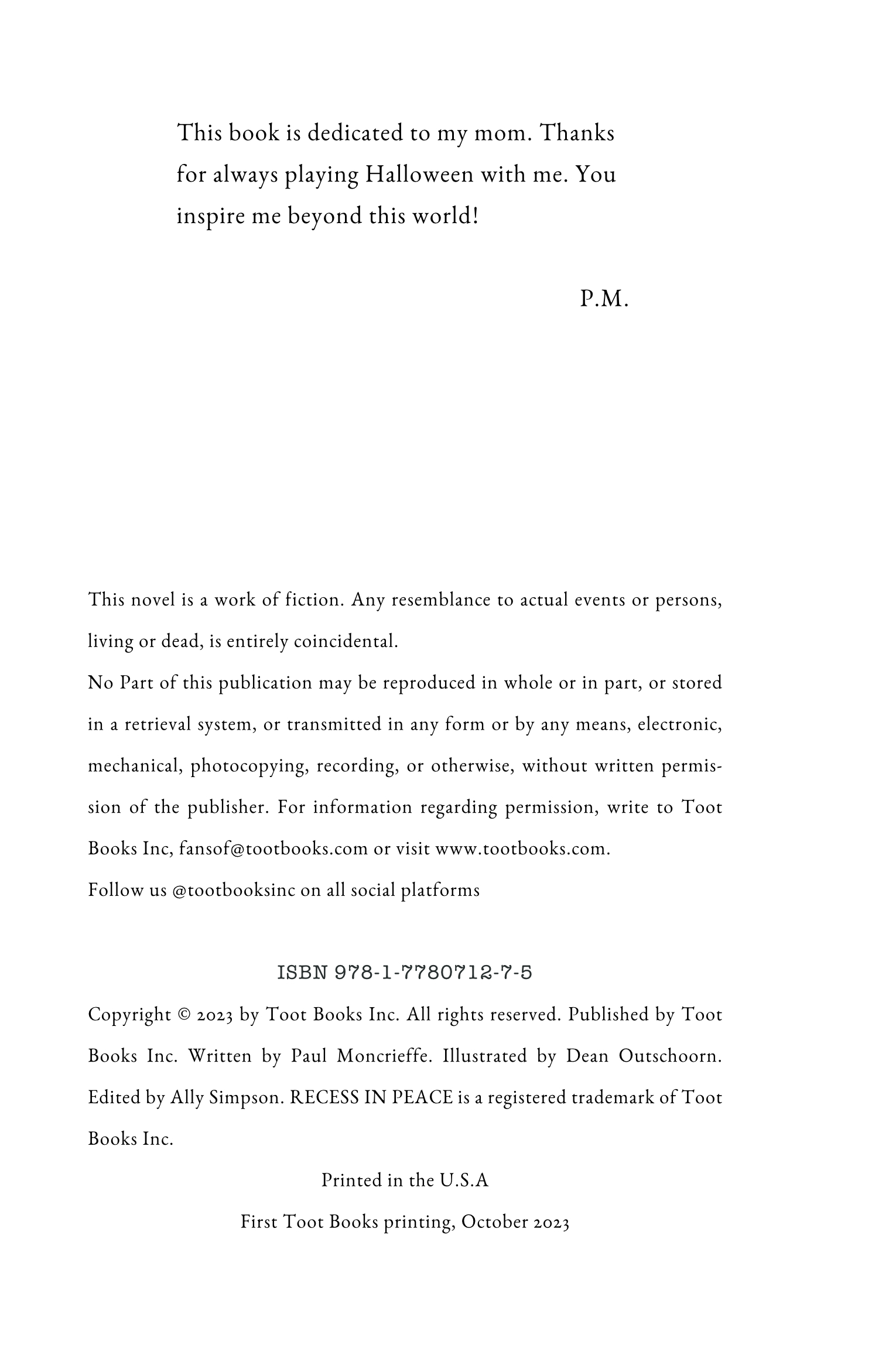 Toot Books presents an all-new haunting middle-grade series, RECESS IN PEACE. This spine-chilling, lightly serialized series will tackle kid's horror as we've never seen it before... On the playground, during recess! Every scare will occur on Fall Valley Academy's playground. Every story will stem from the hero's main feelings while on a mind-melting recess adventure. In our first installment, DAWN OF THE DEAD KID, Pacey Graham is the twelve-year-old shy new kid at Fall Valley Academy. His new school is the biggest place ever. At least it'll be easy for Pacey to hide in the shadows, just the way he likes it. But there's something else lurking in the darkness with him, something that will root through his feelings and force him to take a new bite out of life. We all know being the new kid is tough, but being the new kid who's turning into a ZOMBIE… that's just deadly.